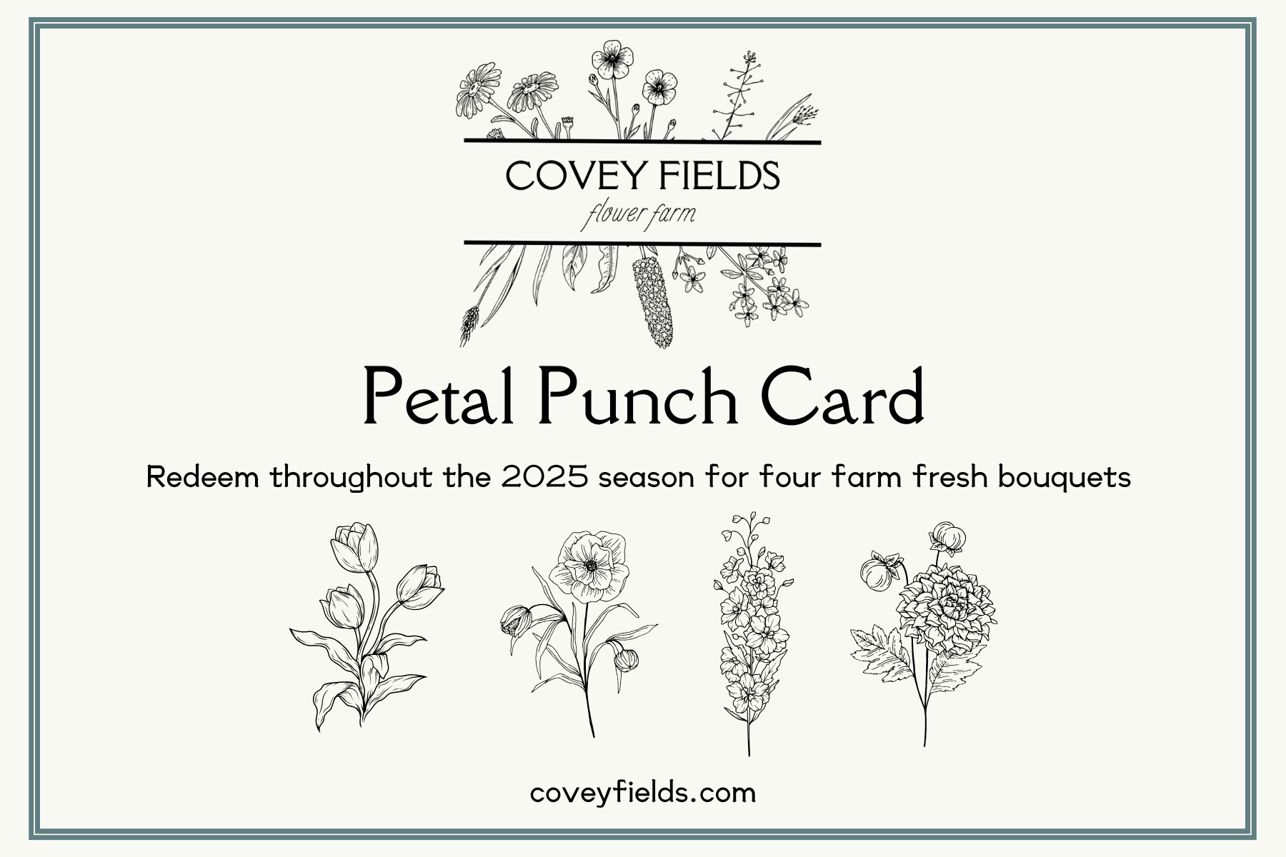 Give yourself or someone you love the gift of local flowers! A petal punch card pre-purchases 4 bouquets that you can redeem throughout the season. It is a way to guarantee first access to fresh flowers and support a local farm just like a CSA, but with more flexibility for you!